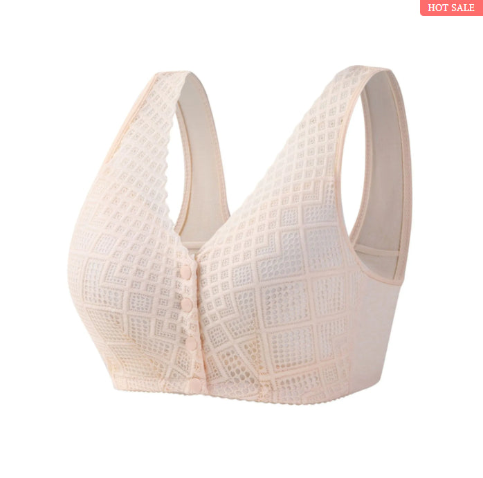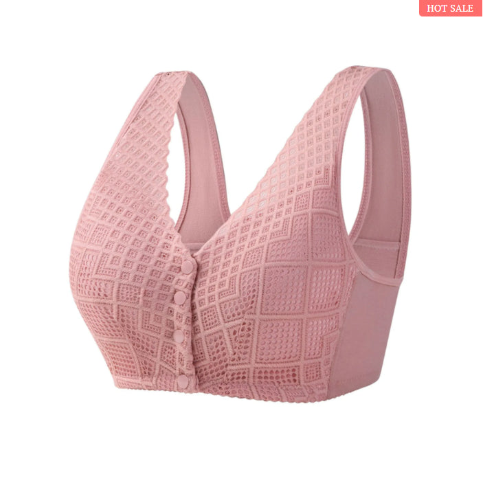 Der Button Bra ist weich, breit und leicht gepolstert. Sein U-förmiger Rücken bietet Halt und ganztägigen Schutz, ohne Beulen und Rückenschmerzen zu hinterlassen. Der Verschluss auf der Vorderseite sorgt für ein einfaches Anziehen und eine gute Passform.
